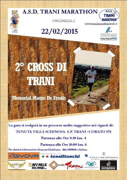 Fervono alacremente i lavori organizzativi della Trani Marathon per l’organizzazione del 2° cross di Trani, gara regionale di corsa campestre che si svolgerà sullo storico percorso della tenuta Villa Schinosa sui viali correnti i vigneti della tenuta.