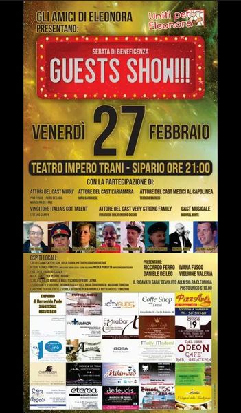Per la settimana prossima è stato organizzato un nuovo evento con sipario alle ore 21 di domani, venerdì 27 febbraio. Una serata di beneficenza targata "Uniti per Eleonora". Sul palco si alterneranno attori del Cast Mudù, attori de L'Ariamara, Medici al capolinea, Very Strong Family, Stefano Scarpa e tanti altri.