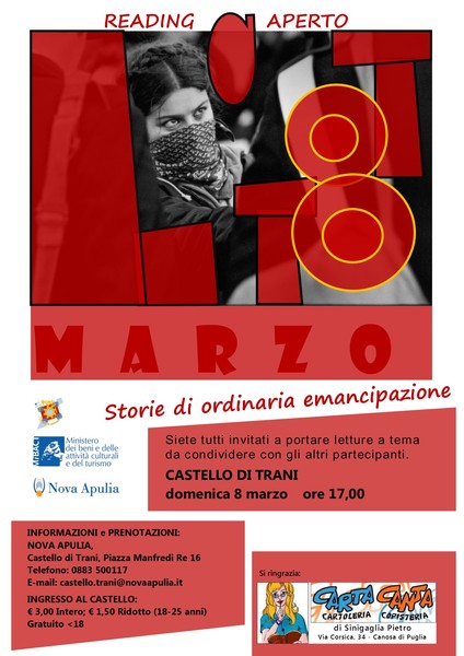 La società di servizi concessionaria del Mibact Nova Apulia scarl ha organizzato un reading letterario aperto in occasione della Giornata Internazionale della Donna che si terrà l’8 marzo alle ore 17,00 presso il Castello di Trani. Gli organizzatori si sono impegnati in un’attenta selezione di testi con l’obiettivo di dare una visione complessiva del fenomeno ‘emancipazione’: da quelli che sono stati i passi in avanti verso l’indipendenza femminile, con particolare attenzione alle grandi donne che hanno scritto la storia, alle situazioni, ambienti, società in cui alle donne non vengono riconosciuti diritti. E perché no, sottolineare anche la presenza di quelle donne che, davanti a un diritto, preferiscono non averlo perché vittime di una società emancipata solo sulla carta.