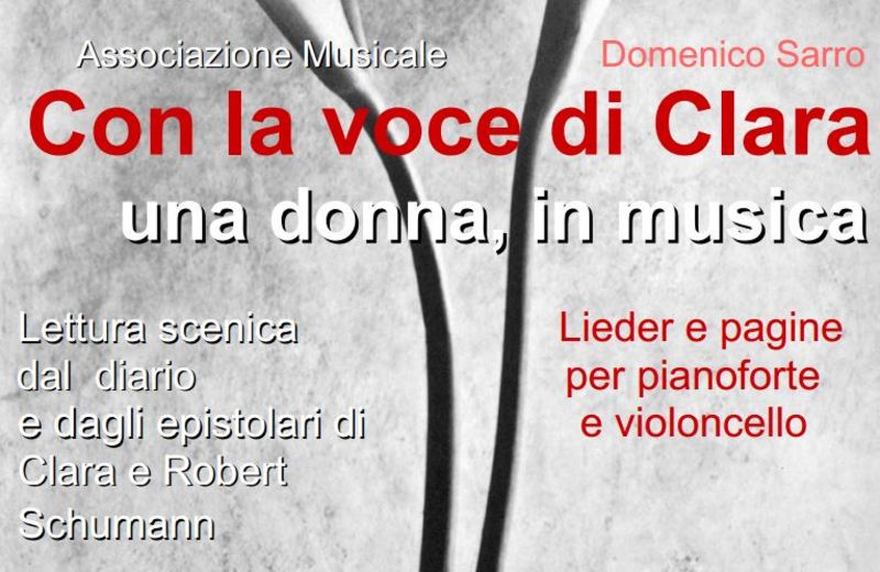 L'associazione musicale e culturale Domenico Sarro propone un concerto, dal titolo «Con la voce di Clara. Una donna, in musica», che guiderà gli spettatori in un viaggio tra i lieder di Clara e Robert Schumann attraverso la lettura di pagine di diario e epistolari.