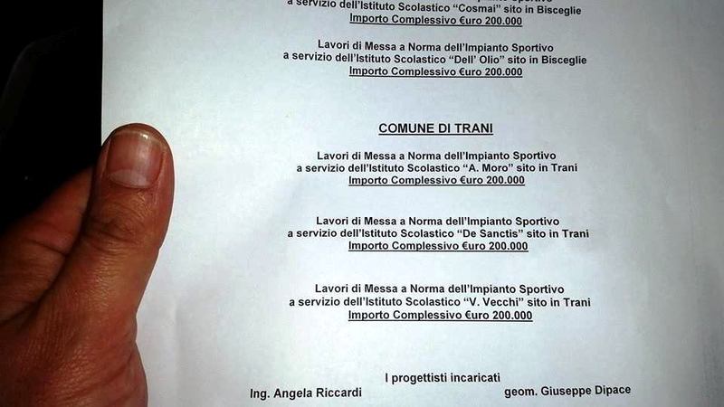 A darne notizia è il consigliere provinciale Giuseppe Corrado, che fa sapere che «la provincia di Barletta-Andria-Trani è stata l'unica in Puglia ad avere intercettato i fondi del Coni per impianti sportivi delle scuole provinciali. Attraverso il credito sportivo a tasso zero finanzieremo la messa in sicurezza e la realizzazione di nuovi impianti. In tutto sono 17 e Trani è presente con tre. È un grande risultato per la nostra provincia ed anche per la nostra città. Mentre gli altri si perdono nelle polemiche negli spot elettorali, noi ci occupiamo delle cose serie. Mi sono battuto affinché la nostra città non perdesse questa opportunità e sono orgoglioso del risultato raggiunto: Trani sta tornando protagonista nelle scelte importanti. Un ringraziamento ai dirigenti scolastici, ai dipendenti dell'Ufficio tecnico della Provincia, che hanno redatto i progetti, ed un grazie particolare al presidente Francesco Spina, sempre attento alle esigenze del territorio e della nostra città».
