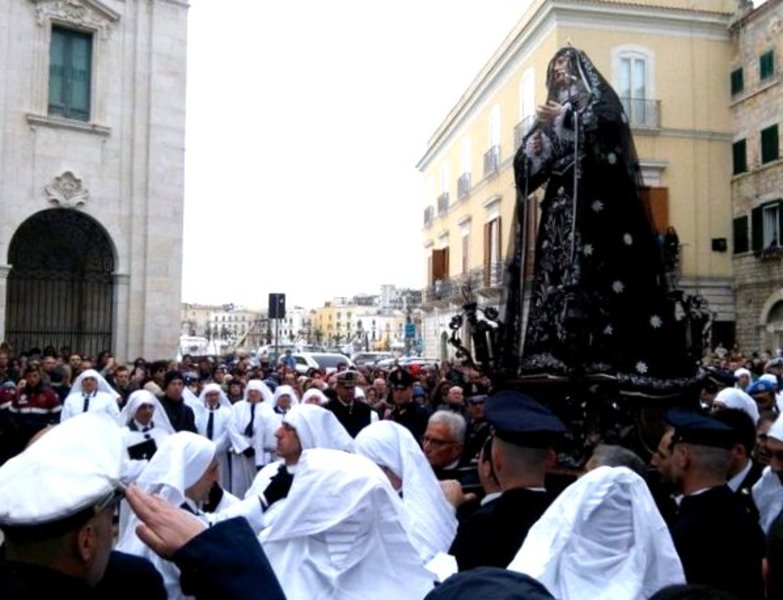 Alle 3, con partenza dalla chiesa di Santa Teresa, comincia la processione di penitenza dell’Addolorata, cui la cittadinanza tranese serba sentita e particolare devozione. Peraltro, si tratta di una delle processioni del periodo di Pasqua più suggestive di tutta la Puglia. Piccola modifica di percorso per la processione: il corteo, uscendo dalla chiesa di Sant'Antonio, allungherà leggermente il suo itinerario svoltando non più in via Nicola de Roggiero, ma in corso Imbriani, per poi raggiungere la chiesa parrocchiale di Santa Maria del Pozzo da via delle Crociate.