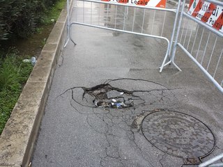 Ci sono le transenne a delimitare una porzione di asfalto che ha ceduto in piazza Martiri di via Fani, nei pressi dell'intersezione con via Dell'Olio, sulla carreggiata che si percorre in direzione dell'ospedale San Nicola Pellegrino. Intorno a un tombino si è distaccata una notevole porzione di conglomerato bituminoso, che potrebbe essere anche il preludio ad un ulteriore e più ampio cedimento.