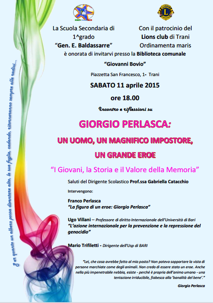 I ragazzi della Scuola media "Gen. E. Baldassarre" incontreranno oggi, sabato 11 aprile, alle 18 presso la biblioteca comunale Giovanni Bovio, Franco Perlasca, figlio dell'eroe Giorgio.