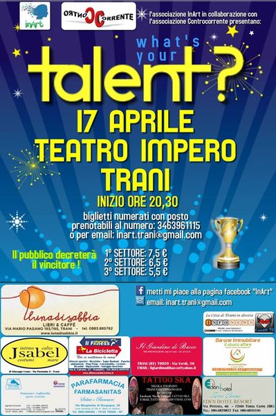 «What’s your talent?» È un talent show pensato dall’associazione Inart e dedicato agli artisti e chi possieda un "talento" da valorizzare e mettere in mostra. Il format oggi, venerdì 17 aprile, vivrà la fase finale, alle 20.30, al teatro Impero. Sarà il pubblico a decretare il vincitore, cui sarà corrisposto un premio in danaro.