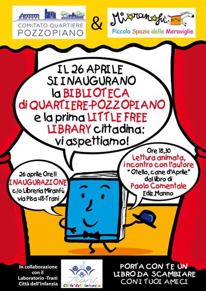 Nasce a Trani la prima Biblioteca di quartiere. È del Comitato quartiere Pozzo piano. Il 23 aprile sarà la giornata mondiale del libro e la biblioteca sarà inaugurata il 26 aprile 2015 alle ore 11,00, in via Pisa n. 48. Il “Bibliopoint” sarà ospitato all’interno degli spazi di “Miranfù”, la libreria dei bambini.
