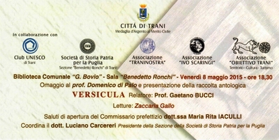 Oggi, venerdì 8 maggio, alle 18.30, presso la biblioteca comunale, il commissario straordinario, Maria Rita Iaculli, offrirà al professor Domenico di Palo una targa celebrativa «quale segno di riconoscenza della Città di Trani nei confronti dell’insigne concittadino, che ha rappresentato una voce considerevole per la sua originalità culturale e la creatività poetica e letteraria nel panorama tranese degli ultimi sessant’anni».