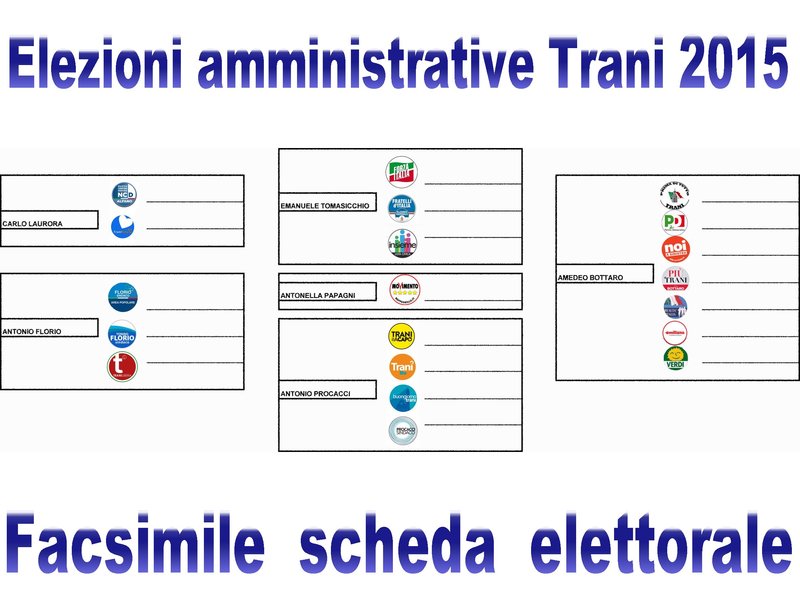 Ebbene, secondo quanto la sorte ha decretato, la prima posizione in scheda, in alto a sinistra, è andata del candidato sindaco di centrodestra Carlo Laurora, nel cui spazio figurano, in sequenza, Nuovo centrodestra e Trani futura. Sotto di lui, un altro candidato di centrodestra, Antonio Florio, con, nell'ordine, Area popolare, Tonino Florio sindaco e Trani libera, vale a dire le sue tre liste civiche.