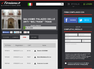 Dopo la biblioteca comunale, anche per Palazzo Beltrani spunta una petizione on line per preservare la struttura del Palazzo delle arti rispetto al progetto di gestione gratuita per un anno, con possibile rinnovo per il secondo, già affidata a seguito di procedura ad evidenza pubblica dall'amministrazione comunale in favore di un'associazione temporanea di scopo capeggiata dall'associazione Xiao Yan rondine che ride.