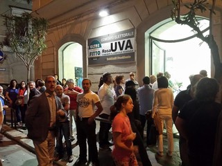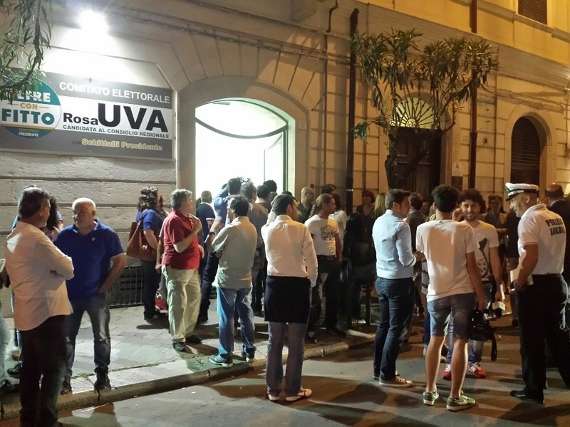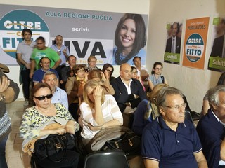 Cori e striscioni per Raffaele Fitto, tornato a Trani ieri sera per sostenere la candidatura al consiglio regionale di Rosa Uva. Insieme con lui, l'onorevole Antonio Distaso, già segretario regionale di Forza Italia.