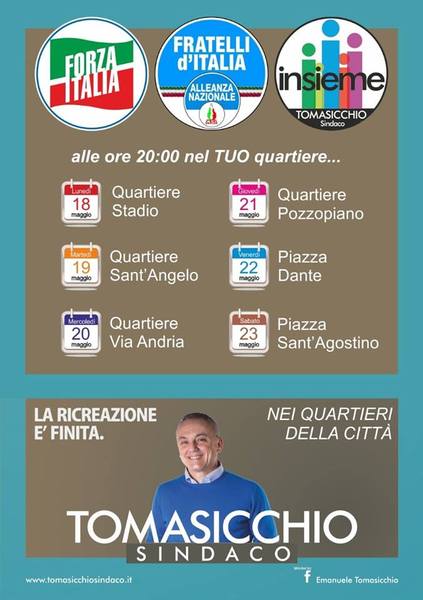 Si è tenuto ieri il primo dei programmati incontri con gli abitanti dei vari quartieri della Città, del Candidato Sindaco del Centrodestra, Emanuele Tomasicchio. S’è fortissimamente deciso di partire dalla zona Sant’Angelo, uno dei quartieri più bistrattati della Città a partire dalla sua genesi sino ad oggi.