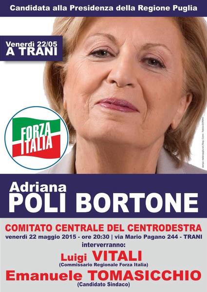 A seguire, alle 21, presso il comitato di Via Mario Pagano, 244, giungerà Adriana Poli Bortone, candidato governatore della Puglia.