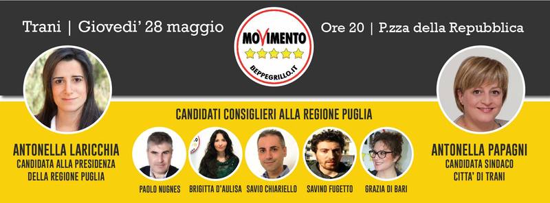 Oggi, giovedì 28 maggio, alle 20, in piazza della Repubblica, comizio elettorale del Movimento 5 stelle. Sarà presente il candidato governatore della Regione Puglia, Antonella Laricchia, e, con lei, i candidati al consiglio regionale: Paolo Nugnes; Brigitta D’Aulisa; Savio Chiariello; Savino Fugetto; Grazia Di Bari. Sul palco anche il candidato sindaco, Antonella Papagni, ed i candidati al consiglio comunale di Trani.
