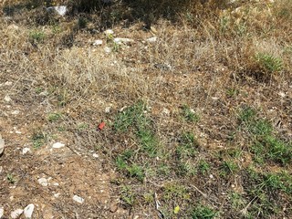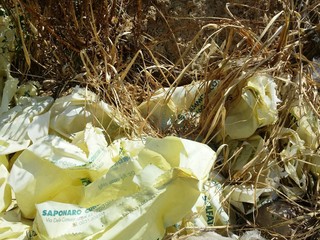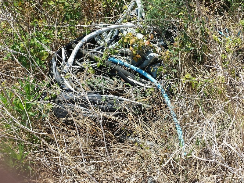 Sventrata ed abbandonata, dentro contiene di tutto ma anche ai margini, girando alla ricerca di varchi per accedervi, si è trovato di non meno inquietante: un cumulo di lastre incendiate, che sembrano pannelli fotovoltaici illecitamente smaltiti; sacchi di ammoniaca; laterizi; guaine di cavi di irrigazione e corrente, questi ultimi forse scartati dopo i soliti furti di rame; una porzione di terreno contenente una sostanza, di colore marrone scuro, probabilmente anche questa residuo di un incendio avvenuto in tempi non meglio precisati. E non mancano bossoli di proiettili da caccia, a conferma del fatto che in questa zona succede veramente di tutto, senza alcun controllo.