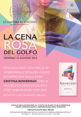 Nota particolare della serata è data dalla presenza di una pugliese doc trasferitasi in America e ritornata in Italia per approfondire la conoscenza della nostra cucina. Cristina Bowerman, Stella Michelin, Chef donna dell’anno 2013 per Identità Golose e Chef AmbassadorExpo 2015, ora chef delGlass di Roma, ritornerà in Puglia proponendo un menù esclusivo con il Resident Chef de Le Lampare al Fortino Giovanni Lorusso, cuoco dell'anno 2011 e quarto classificato al Global Chef Challenge 2014.La serata sarà divisa in due parti: un primo momento d’incontro e degustazione all’arrivo con il “Brut Rosé” Metodo Classico accompagnato da una selezione di antipasti, ed una seconda parte con la cena e degustazione del “Rosa del Golfo” 2014 e del “Vigna Mazzì” 2013, sulla splendida terrazza del Ristorante, noto come uno dei migliori ristoranti di tutta la Puglia.