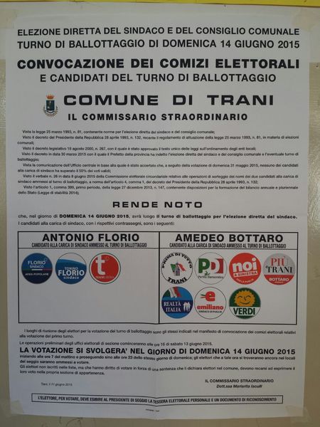 Sono 5.584 le persone che hanno votato alle ore 12 di quest'oggi per l'elezione del prossimo sindaco di Trani al ballottaggio. Un numero pari all'11,69% degli aventi diritto al voto, alle ore 12 del primo giorno di ballottaggio (si votava domenica e lunedì sino alle 15) nel 2012 invece si raggiunse il 12%.