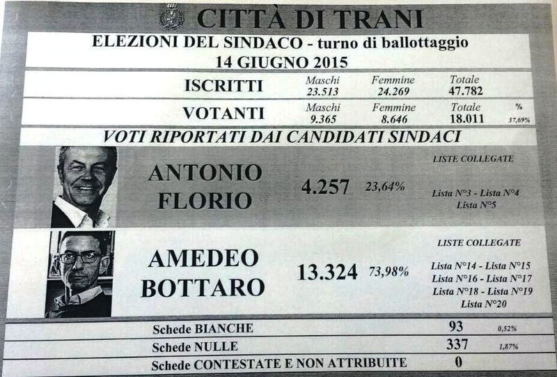 Al secondo turno ha votato a Trani il 37.69% degli aventi diritto (18.011 su 47.782).