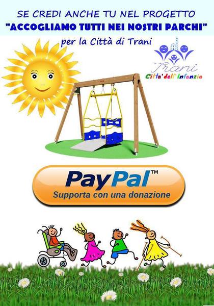 Un’altalena per diversamente abili è l'obiettivo di un’iniziativa di solidarietà che il progetto Trani città dell'infanzia sta promuovendo attraverso una raccolta di fondi presso alcuni luoghi di riferimento, fra cui attività commerciali, studi professionali ed altro. È possibile anche una donazione, tramite Paypal, all'indirizzo di posta elettronica parchi accessibili@cittàdellinfanzia.it.