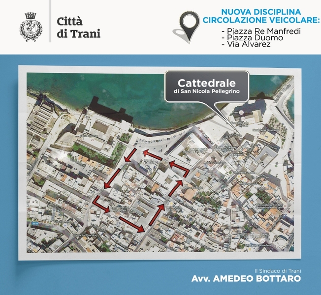 Nel dettaglio, attraverso un’ordinanza (pubblicata sull’albo pretorio on line del Comune di Trani), si è deciso di istituire la zona a traffico limitato (dalle 00.00 alle 24.00) su piazza Duomo, dal limite di piazza Re Manfredi sino a via Beltrani, riservando l’accesso (transito e sosta) solo a particolari categorie di utenti e veicoli, ovvero magistrati e ad ulteriore utenza da questi ultimi individuata (ad esempio personale addetto alla scorta o altri). Su piazza Re Manfredi (lungo il perimetro del fabbricato del palazzo di giustizia, più precisamente nel tratto compreso tra via Accademia dei Pellegrini e piazza Duomo) vengono riservati 16 spazi alla sosta dei veicoli degli organi di Polizia stradale (articolo 12 del codice della strada), dei Vigili del fuoco e dei servizi di soccorso, nonché 4 spazi a quelli adibiti al servizio di persone con limitata o impedita capacità motoria, muniti del contrassegno speciale. L’area di parcheggio a pagamento ubicata in piazza Re Manfredi (più precisamente la parte retrostante ed adiacente palazzo Carcano, oggi area sterrata) e la relativa area di sosta a corona viene individuata quale area su cui consentire ai soli dipendenti in servizio presso le sedi del palazzo di giustizia (zona tribunale) e durante le ore in cui lo stesso è funzionante, la sosta in esenzione del pagamento del ticket orario o giornaliero valido sulla zona blu. Il modello di contrassegno che verrà rilasciato per i veicoli dei dipendenti consentirà la sosta solo nell’area in questione (da 38 posti) sino a saturazione della stessa. Pertanto, il contrassegno non costituirà privilegio all’ottenimento di un posto riservato ma esclusivamente l’esenzione dal pagamento della tariffa della sosta. Su via Accademia dei Pellegrini (tratto compreso tra via Beltrani e piazza Re Manfredi) viene individuata una nuova rea di sosta a pagamento per un totale di 10 posti auto. Viene infine confermata l’area di parcheggio libera in via Lionelli, con la realizzazione di 67 stalli liberi, di cui 2 destinati alla sosta di veicoli adibiti al servizio di persone con limitata o impedita capacità motoria (articolo 2 del codice della strada).