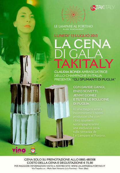 Il secondo appuntamento pugliese si articola in due giornate: oggi, martedì 14 luglio, presso lo slow restaurant Le lampare al fortino di Trani, quella conclusiva della manifestazione dal titolo “Gli spumanti di Puglia”, sarà presentata da Claudia Bondi, fiorentina, sommelier e degustatore ufficiale, vincitrice del “Nebbiolo Master” 2011 e del “Master del Sangiovese” 2012.