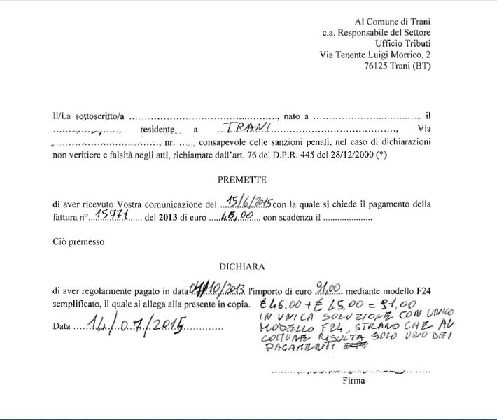 Lo stesso cittadino ha così dovuto inviare un' autocertificazione al Comune di Trani, per dimostrare l'avvenuto pagamento della tassa in un'unica soluzione. «Il problema - fa sapere - è che, nelle mie stesse condizioni, si trovano tanti altri cittadini ai quali, tra l'altro, sono stati inviati avvisi tramite raccomandata con ricevuta di ritorno costati al Comune una somma ingente a carico della collettività». Insomma oltre il danno dei disagi, la beffa di un aggravio di costi evitabile.