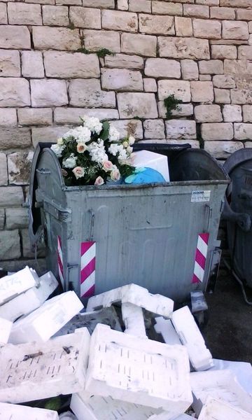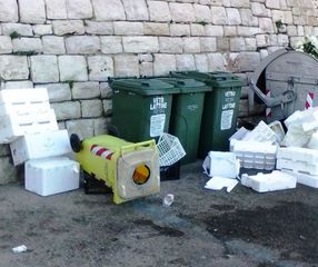 Poi però, abbiamo documentato lo stato di degrado di porta Vassalla al di là di quel muro e, oggi, ci soffermiamo invece su quello che accade al di qua della stessa cinta antica della città, mostrando il conferimento senza regole di cassette di polistirolo, fiori ed altro materiale stoccato alla meno peggio dentro e, soprattutto, fuori dei cassonetti dei rifiuti.