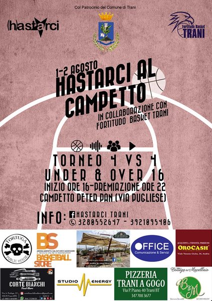 Oggi, domenica 2 agosto, il circolo Arci di Trani “(H)astarci”, in collaborazione con “Fortitudo basket Trani giovani”, conclude la due giorni all’insegna del basket. La manifestazione, patrocinata dal Comune di Trani, nasce allo scopo di creare un momento di aggregazione, ma soprattutto porre l’attenzione su un importante punto di ritrovo, per tutti gli appassionati di basket, in una città in cui scarseggiano spazi di aggregazione. Appuntamento al campetto Peter Pan (via Pugliese, zona stadio), oggi, domenica 2 agosto, con il torneo over 16. L’inizio delle partite è previsto per le 16.