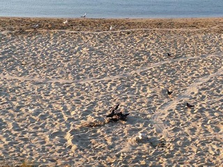 Stamani, sulla stessa spiaggia, gruppi di colombi beccano un po' ovunque, cercando e trovando i resti di quanto consumato. Per la verità, ci aspettavamo di trovare anche buste di spazzatura e rifiuti sparsi tra la sabbia, ma questa circostanza, per fortuna c'è stata risparmiata.