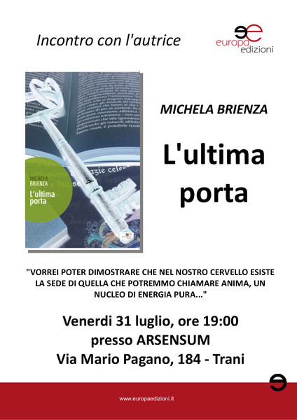 Oggi, venerdì 31 luglio, alle 19, presso la sede dell’associazione culturale “Arsensum”, in via Mario Pagano 184, Michela Brienza presenterà, per la prima volta a Trani, il suo romanzo dal titolo “L’ultima porta” (Europa Edizioni).