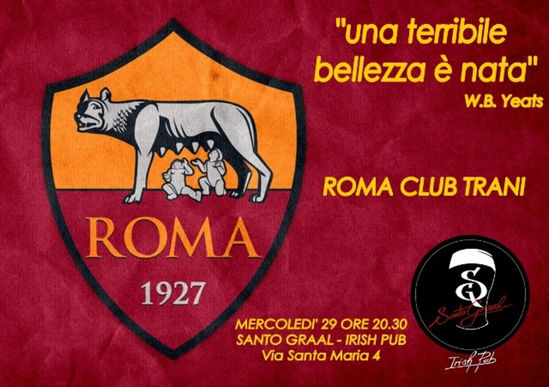 “Una terribile bellezza è nata” con la celebre frase del poeta irlandese William Butler Yeats si presenta il primo Roma Club ufficiale della Città di Trani. Il club, affiliato all’Airc (Associazione Italiana Roma Club), consentirà agli iscritti di avere un canale preferenziale per l’acquisto dei biglietti e un servizio “alfieri” presso la Tribuna Tevere dell’Olimpico per le partite casalinghe.