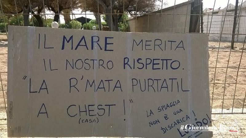 Oggi abbiamo verificato la situazione e ci è balzato subito agli occhi un cartello apposto all'ingresso della spiaggia adiacente al lido, quella pubblica. Il cartello, piuttosto colorito, invita i cittadini a non sporcare. Di sicuro posizionato lì da un cittadino civile stanco di vedere quel tratto di costa deturpato da altri cittadini non altrettanto puliti e civili.