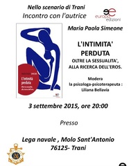 «L'intimità perduta. Oltre la sessualità alla ricerca dell'eros» è il titolo del libro di Maria Paola Simeone, che sarà presente a Trani questa sera, alle 20, presso la Lega navale, per uno degli incontri con l'autore organizzati dal sodalizio nautico. Modera la psicologa e psicoterapeuta Liliana Bellavia. Ingresso libero