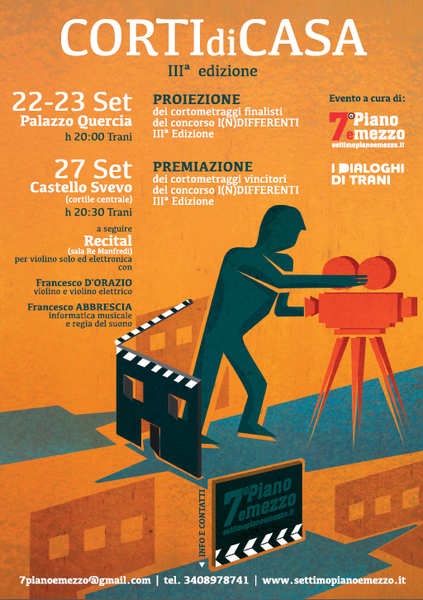 L’Associazione culturale Settimo piano e mezzo organizza la terza edizione di Corti di casa, evento inserito nel programma de I dialoghi di Trani. La manifestazione si concluderà oggi, domenica 27 settembre, al castello svevo, dove verranno proclamati i corti vincitori della rassegna. Seguirà un recital per violino solo ed elettronica eseguito da Francesco D'Orazio e Francesco Abbrescia.