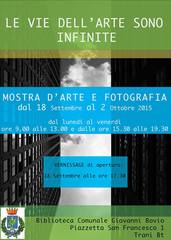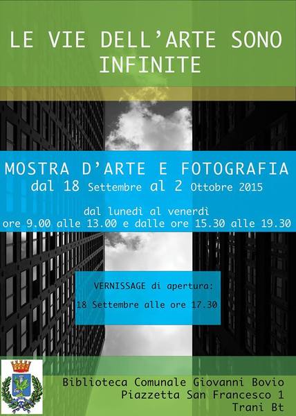 Si concluderà oggi, venerdì 2 ottobre, presso la biblioteca comunale Giovanni Bovio, il primo appuntamento culturale della stagione dopo la pausa estiva, ovvero la mostra "Le vie dell'arte sono infinite". Si tratta di una collettiva d’arte e fotografia di alcuni artisti locali. L’esposizione, organizzata da Rossella De Palma e Nicola Pappalettera, raccoglie ed espone incantevoli percorsi artistici, cui si alternano produzioni fotografiche di grande spessore. Esporranno Francesca Buonacara, Mariano Doronzo, Francesca Ribatti, Giovanni Causarano e Vincenzo Spadavecchia. La mostra è patrocinata dal Comune di Trani nell’ambito delle manifestazioni estive. Questi gli orari: dalle 9 alle 13 e dalle 15.30 alle 19.30.