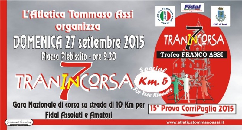 Trani è anche gara nazionale e quindi alla partenza, dove sarà osservato un minuto di raccoglimento per ricordare sia la figura del compianto presidente Franco Assi che del giovane Biagio Zanni recentemente scomparso in una tragica occasione, ci saranno anche atleti provenienti da altre regioni, e in particolare da Matera, Parma, Milano, Roma, Tivoli, Potenza, etc.. A guidare poi il folto plotone degli oltre 400 iscritti alla “For Free Runners” , corsa non agonistica su una distanza di circa 5 km., ci sarà lo stesso Sindaco della Città di Trani, Amedeo Bottaro, a cui sarà affidato anche il compito di dare il via alla manifestazione con il classico colpo di pistola. Così si darà a tutti la possibilità di cimentarsi in una manifestazione podistica e di respirare da protagonista l’aria di un grande evento. Per loro i premi saranno attribuiti solo per il trucco e parrucco più colorato, stravagante ed originale. A seguire ci saranno anche gli amici dell’Unitalsi che faranno il percorso breve previsto per i ragazzi.