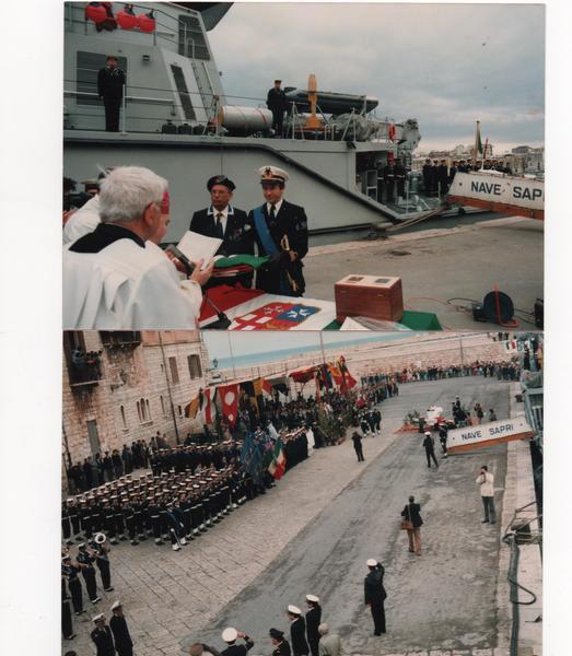 Era infatti, il 19 aprile del 1986 quando nave Sapri subito dopo essere stata varata, attraccò nel porto di Trani dove il Gruppo Anmi locale, rappresentato dall’allora presidente cavaliere Giuseppe Amato, donò la bandiera al cacciamine. Presenziò la cerimonia di consegna il Capo di Stato maggiore della marina militare, ammiraglio di squadra, Giasone Piccioni.