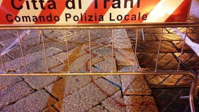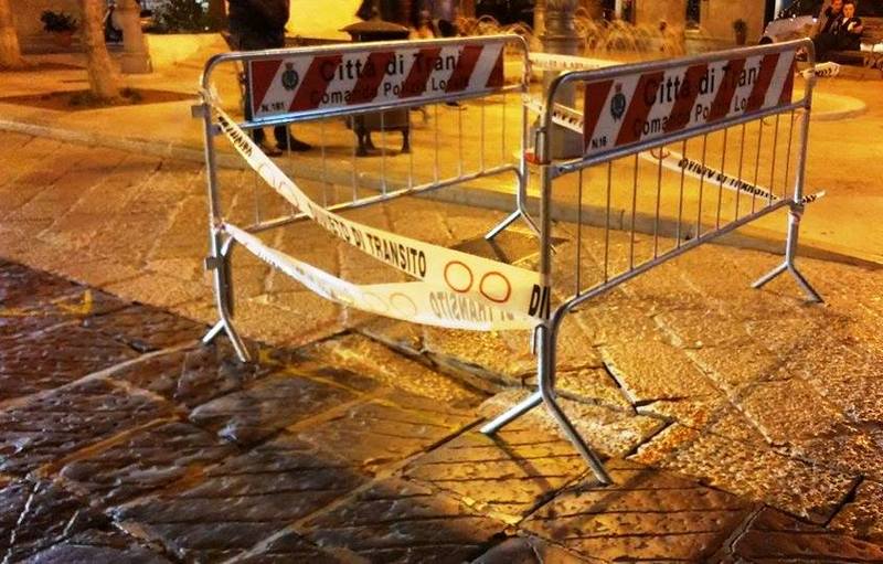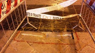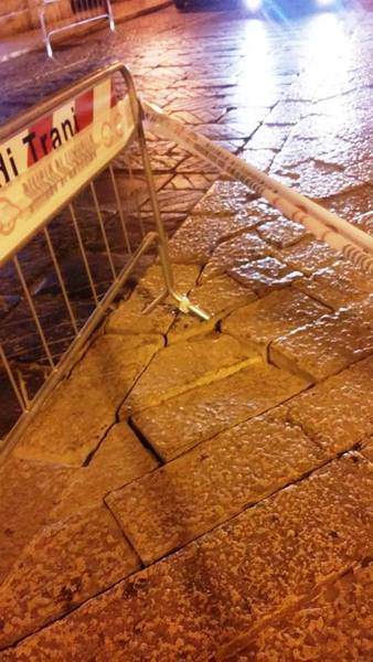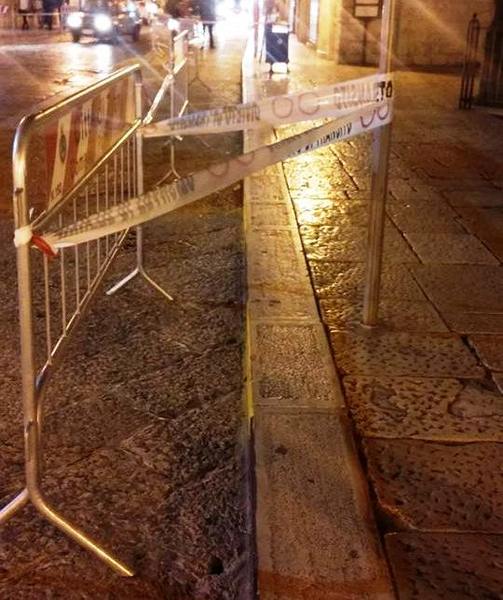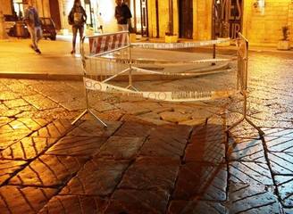 Sono due, o forse anche tre i cedimementi in atto ed almeno, oltre le transenne, si nota anche una tracciatura di vernice rossa intorno alle basole profondamente disconnesse, probabile preludio ad urgenti lavori di messa in sicurezza e ripristino.