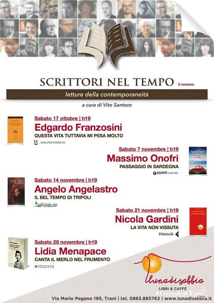 Torna la rassegna letteraria "Scrittori nel tempo", a cura del critico e saggista Vito Santoro. Dopo il primo, fortunato, ciclo di incontri, che ha visto protagonisti autori noti della lettaratura contemporanea italiana, Luna di sabbia propone un secondo ciclo di dibattiti culturali.