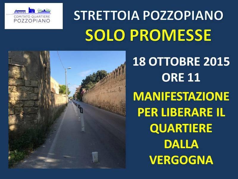 Questa è l'ultima iniziativa che i commercianti e residenti del quartiere, insieme alla presidente Rosanna Nenna, vogliono promuovere, perché, scrivono gli organizzatori, «da decenni la strettoia di pozzo piano ha solo visto scorrere fiumi di parole, di promesse, ma nessun atto concreto. Chiediamo che per pubblica utilità la strada venga allargata, che venga dato al quartiere e alla città quel volto degno di un paese civile perché – proseguono gli organizzatori – il quartiere non può più aspettare».