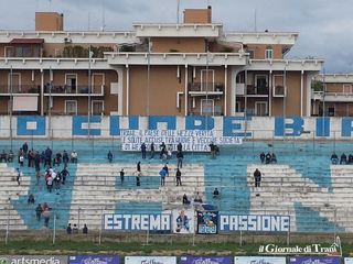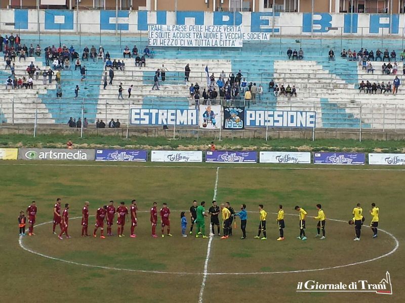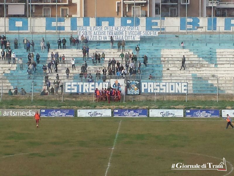 Striscione polemico del tifo organizzato dopo le dichiarazioni societarie degli ultimi giorni: "Trani, il paese delle mezze verità. Le solite accuse tra nuove e vecchie società, e di mezzo ci va tutta la città".