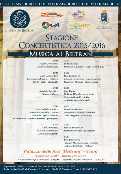 L’Ats “Il Bello del Beltrani” presenta la stagione concertistica 2015/2016 “Musica al Beltrani”, un cartellone composto da ben undici concerti, che quest’anno si svolgerà presso il meraviglioso Palazzo delle Arti “Beltrani”: scelta quanto mai opportuna poiché si tratta di un luogo particolarmente suggestivo e idoneo ad ospitare manifestazioni di elevato spessore artistico.