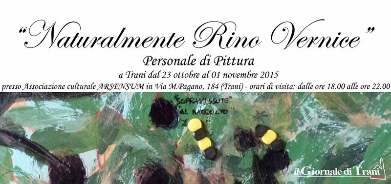 Originalità, luce, materia, tematica ambientalista sono gli elementi essenziali che, grazie all’esposizione personale dell’artista Rino Vernice, arricchiranno l’autunno dell’associazione culturale Arsensum. La mostra, intitolata Naturalmente Rino Vernice, è aperta al pubblico fino a domenica 1mo novembre, dalle 18 alle 22 nella sede dell’associazione in Via Mario Pagano 184 a Trani. Per maggiori informazioni, visitare la pagina facebook Arsensum o telefonare al 3463181360.