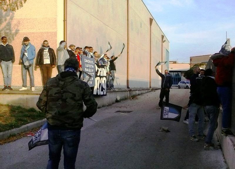 Da segnalare l’incitamento fuori campo di una trentina di tifosi organizzati del Trani, che si sono rifiuti di cedere al presunto ricatto di un prezzo del biglietto ritenuto troppo alto: hanno seguito la partita fuori del recinto, non mancando di cantare ininterrottamente.