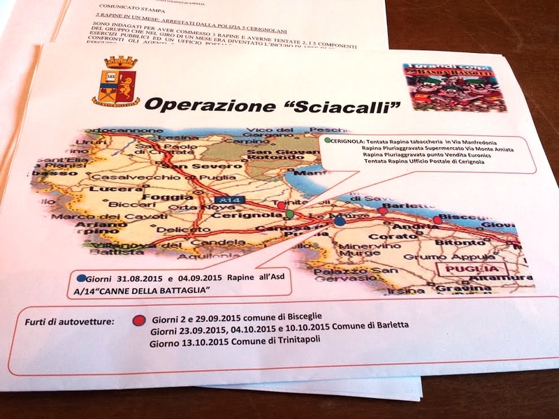In particolare, al gruppo dei rapinatori vengono contestati i seguenti reati: una rapina aggravata nei confronti di un distributore carburanti e all’esercizio commerciale collegato dell’area di servizio dell’autostrada A14 Canne Sud (Canosa) del 4 settembre 2015; la tentata rapina di una tabaccheria a Cerignola e le rapine consumate presso il supermercato Gm e l’esercizio commerciale Euronics, di Cerignola, il 21 settembre; la tentata rapina presso l’ufficio Postale centrale di Cerignola, l’8 ottobre 2015; i furti aggravati di sei autovetture, poi utilizzate durante le rapine. Inoltre, nel corso dell’attività di polizia, sono state sventate alcune rapine in fase di preparazione. Il bottino variava da poche centinaia sino a 2.000 euro, somme non altissime, ma per accaparrarsi le quali i rapinatori non esitavano a ricorrere a modi violenti, coperti da guanti e passamontagna, ed armati di coltelli, mazze e pistole.