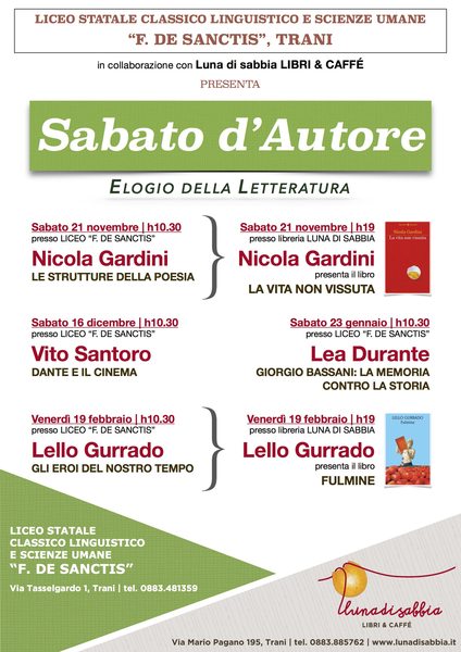Il Liceo statale classico linguistico e scienze umane "F. De Sanctis" di Trani, in collaborazione con la libreria Luna di sabbia, presenta "Sabato d'autore. Elogio della letteratura”, un progetto di promozione e approfondimento di tematiche letterarie curato da Rossella Piccarrreta e Domenico Parente.