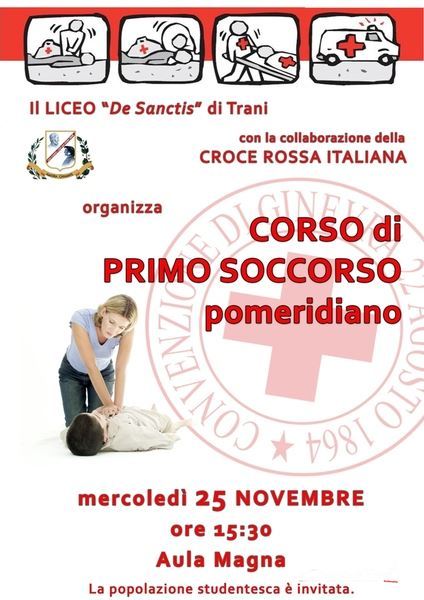 Parte anche a Trani un’iniziativa di Rescue Project rivolta alle scuole, organizzata in un Liceo. Si parla spesso di sicurezza, di sicurezza nelle scuole. Il Liceo “Francesco de Sanctis” con la collaborazione della Croce Rossa Italiana ha organizzato un corso di Primo Soccorso che avrà inizio mercoledì 25 novembre.
