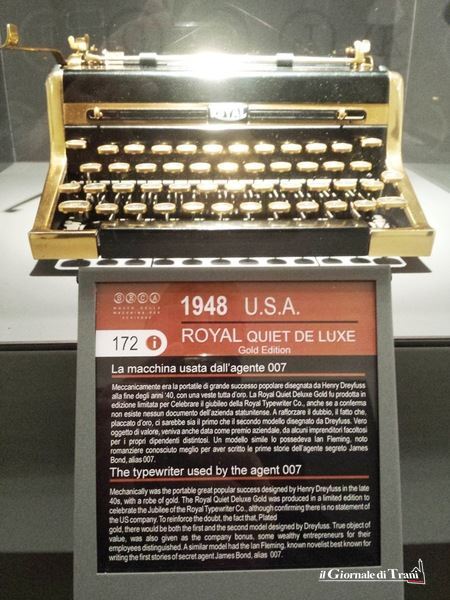 Ed ancora la Royal quiet deluxe, anche questa di marca Usa, del 1948, la macchina usata dall’agente segreto 007 e che si contraddistingue per la sua struttura completamente in oro.
