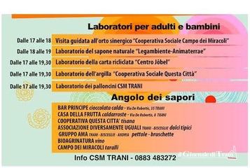 I giardini dell'ex ospedaletto di Trani (via Baldassarre 72) ospiteranno a dicembre (3-17 e 19) la "Fiera solidale dell'arte, dell'artigianato e dei sapori": un mercatino, un progetto di recupero di un luogo pubblico che appartiene a tutti, una iniziativa di lotta allo stigma. Il progetto è coordinato dal Centro di Salute Mentale di Trani ma vede la partecipazione attiva di numerose associazioni di volontariato e di riabilitazione psichiatrica. La Fiera è inoltre patrocinata dal Comune di Trani.