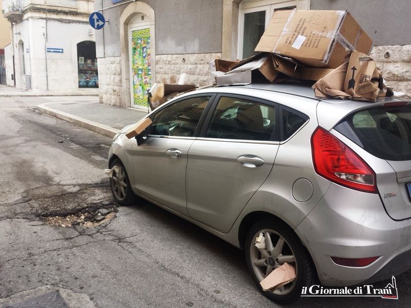 La vettura è stata completamente ricoperta di cartoni che i protagonisti dello scempio hanno prelevato a piene mani dal marciapiede adiacente l’auto, a distanza di circa quindici metri dalla zona in cui il veicolo era parcheggiato.