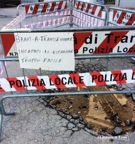 In via Jugoslavia, infatti, qualcuno ha accostato alle transenne, poste a tutela della pubblica incolumità, dei cartelli polemici contro Ufficio tecnico e Comune di Trani, ricordando a se stesso ed a chi legge che non basta una semplice messa in sicurezza se, poi, si lascia tutto com'è per lungo tempo.